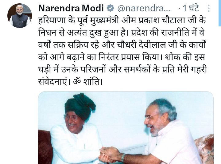 अपने X अकाउंट पर ओमप्रकाश चौटाला के साथ अपना पुराना फोटो साझा करते हुए प्रधानमंत्री नरेन्द्र मोदी ने कहा कि आपके निधन से अत्यंत दुख हुआ। प्रदेश की राजनीति में वे वर्षों तक सक्रिय रहे और चौधरी देवीलाल जी के कार्यों को आगे बढ़ाने का निरंतर प्रयास किया। शोक के इस घड़ी में उनके परिजनों और समर्थकों के प्रति मेरी गहरी संवेदनाएं। ॐ शांति।।