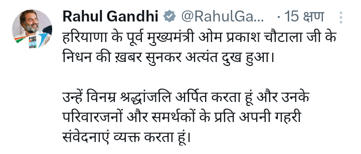 नेता प्रतिपक्ष राहुल गांधी ने भी अपने X अकाउंट पर एक पोस्ट करते हुए लिखा कि ” हरियाणा के पूर्व मुख्यमंत्री ओमप्रकाश चौटाला जी के निधन की खबर सुनकर अत्यंत दुख हुआ। उन्हें विनम्र श्रद्धांजलि अर्पित करता हूं और उनके परिवारजनों और समर्थकों के प्रति गहरी संवेदनाएं व्यक्त करता हूं।”