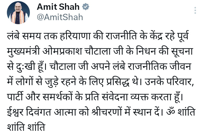 केन्द्रीय गृहमंत्री अमित शाह ने भी अपने X अकाउंट पर एक पोस्ट लिखते हुए ओमप्रकाश चौटाला को श्रद्धांजलि अर्पित की। अमित शाह ने अपने पोस्ट में कहा कि “लंबे समय तक हरियाणा के राजनीति के केन्द्र में रहे पूर्व मुख्यमंत्री ओमप्रकाश चौटाला जी के निधन की सूचना से दुखी हूं। चौटाला जी अपने लंबे राजनीतिक जीवन में लोगों से जूड़े रहने के लिए प्रसिद्ध थे। उनके परिवार, पार्टी और समर्थकों के प्रति संवेदना व्यक्त करता हूं। ईश्वर दिवंगत आत्मा को श्रीचरणों में स्थान दें। ॐ शांति शांति शांति।